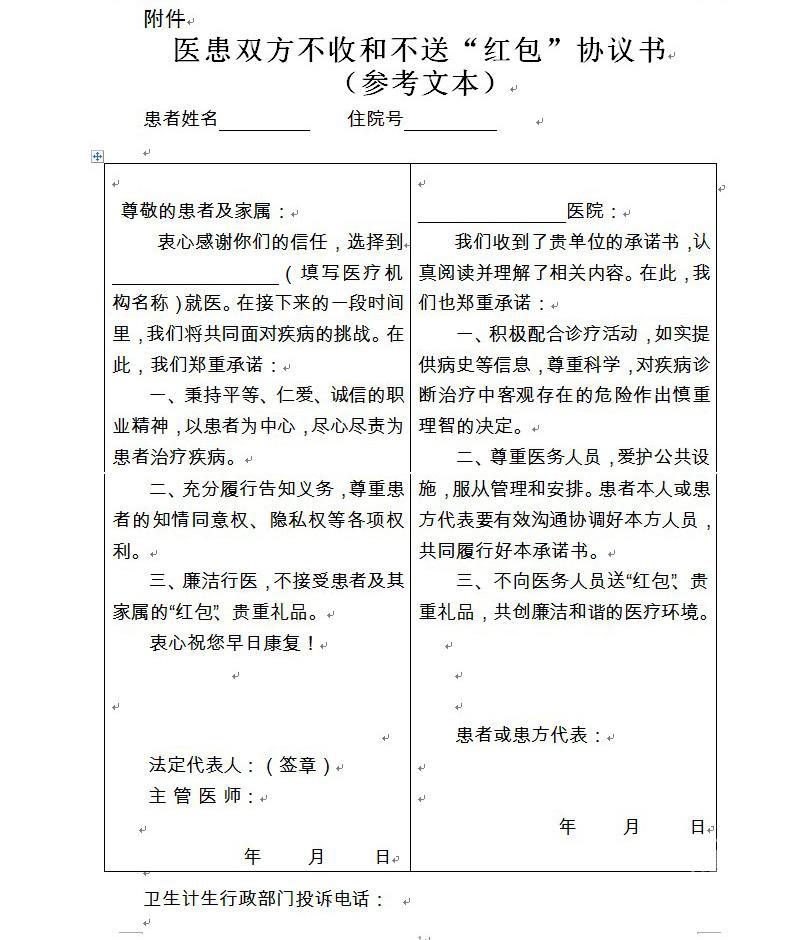 卫计委部署,医疗机构应在患者入院24小时内,由经治医师向患者或患方代表提供《医患双方不收和不送“红包”协议书》;二级以上医院(含开设住院床位的妇幼保健院、专科疾病防治院等)必须开展,其他医疗机构可参照执行。
