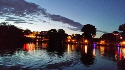 当我身临其境,真的有些恍惚,这是现在的北京吗?远处的天是如此透明,紫灰色的云仿佛是画笔随意点画而出。湖边的灯火慢慢地在湖面飘荡,却以红色的、黄色的、绿色的,蓝色的多彩光影摇曳其上,不记得以前它们是有如此多的艳丽的色彩。