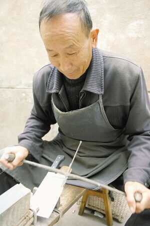 那时小孩子爱干的活就把家里的钝刀和剪子拿出去磨,主要是为了看人家的把式。磨刀的都有一套工具,主要是绑着磨刀石的板凳和镪子,一小罐水。一般是摆好架势,先把刀口拿手摸摸,估计一下钝的程度,如果太钝了,就先拿出很细的镪子,一端顶在肚子上,用力在另一端将菜刀口的两侧削下一层铁屑。那时候一直很惊奇这是什么做的,竟能削铁如泥。然后再把刀放在磨刀石上反复磨。