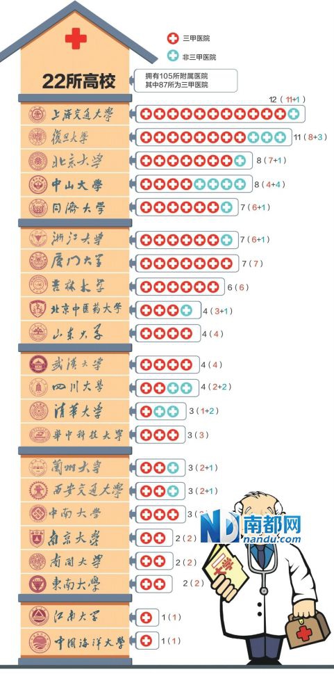 南都记者统计发现,全国75所部属高校旗下多达105所附属医院,其行政、教学、医疗业务、财务等方面均归不同部门负责,教书育人与救死扶伤一举两得,听上去很美,现实却千头万绪难以理清。