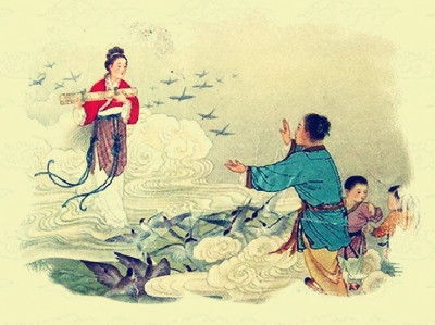 姥姥总是指着银河两边的一颗大而亮、另一颗大前后两颗小的星星又讲起牛郎织女的故事:“快到七夕喽,牛郎挑着一儿一女追赶被玉帝抓回去的织女,那条天河他永远过不去。不过,七夕这一天,喜鹊就会飞来,在天河上搭一条鹊桥,他们就可以过去看到孩子妈妈了。”