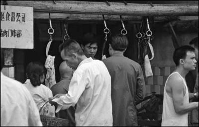 于是我就被派去去胡同口合作社买肉。卖肉的地方墙上有一排大铁钩,勾着一扇扇剔好的猪肉。卖肉的师傅见客人来了,一边拿起一把特宽的明晃晃的大刀在另一只手上的磨刀棒上来回蹭着,一边问:“准备做什么吃啊?”