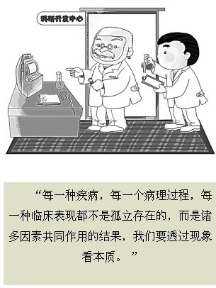 在平时的工作中,我们往往太过关注局部而忽视整体,每一种疾病,每一个病理过程,每一种临床表现都不是孤立存在的,而是诸多因素共同作用的结果。况且,现象与本质往往是分离的,甚至是相反的,必须具有理论思维能力。譬如学者们在各自的领域不遗余力地寻找各种治疗方法和标志物,外科医生在体内寻找癌灶,病理医生在组织中找癌细胞,生物学家在细胞中找癌基因,检验医生在体液中找分子标志物,但目前仍没有找到能够用于早期诊治的敏感标志物和检测方法,因为肿瘤是整体调控失常的全身性疾病,只依靠单方面及单学科是无法解决的。