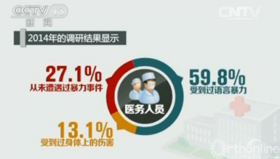 医疗暴力包括语言暴力和行为暴力。2014年的调研结果显示,59.8%的医务人员受到过语言暴力,13.1%的医务人员受到过身体上的伤害,仅有27.1%的医务人员从未遭遇过暴力事件。