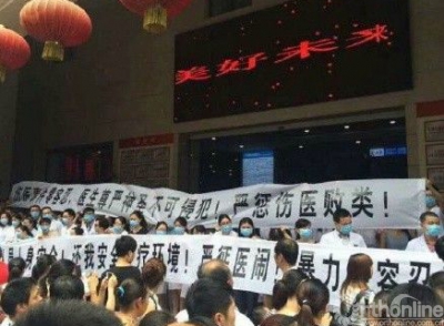 25日中午,网上再现医护人员抗议暴力伤医。因为一名医生6月24日遭患者家属殴打,数十名重庆医科大学附属儿童医院的医护人员,在该院门诊楼门口打出横幅,呼吁维护医生尊严。该院宣传科人员对南都记者表示,事件尚在调查,被打医生正住院接受治疗,医护人员则已疏散。