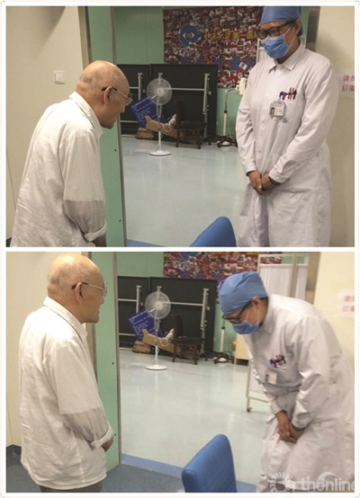 今年7月3日上午也有一张鞠躬照片,发生在北京大学第一医院:患者李老先生不急不躁地来到医学影像科护士孙艳面前,深深地鞠了一躬,“护士您好!我有两个问题想问您……”孙艳赶忙搀扶,鞠躬回礼,并认真回答了李老的问题。李老很是满意,又鞠了一躬,孙艳也赶快向李老鞠躬回敬,李老离开了,孙艳却差点哭出来。