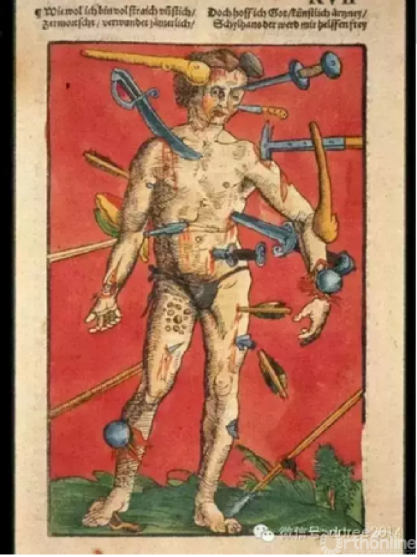 (一副中世纪有关创伤的医学绘画。人是很脆弱的,一旦受伤,身心俱损、性命堪忧。我做过多年的创伤救治工作。我觉得,创伤的威胁可以来自于四面八方,而能够保护我们的,唯有预防。不受伤,才是王道)