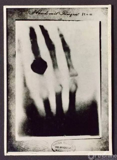 1895年11月8日傍晚,德国物理学家伦琴,做一项关于阴极射线的实验。伦琴用黑纸将阴极射线管完全遮掩好,使之与外界完全隔绝,然后把窗帘放下,打开高压电源,以便检查有没有光线从管仲漏出。突然,他发现有一道绿光从附近的一个板凳射出,掠过他的眼前。他把高压电源关掉,光线也随着消失。他很快意识到有某种崭新的未知光线发生了。伦琴激动地难以控制自己,他把妻子带到实验室里,把用一张黑纸包好的照相干版放在他的手掌下,然后用阴极射线管一照,拍下了历史上最著名的一张照片。冲洗出来的底片清楚地呈现出伦琴夫人的手骨结构,手上那枚金戒指的轮廓也清晰地印在上面。伦琴把一只活生生人的手掌变成了一块骷髅,手指骨骼和结婚戒指在底片上清晰可见,这就是历史上第一张X光照片,成为20世纪物理学发展的一个里程碑式的标志。伦琴也由此获得了世界上第一次诺贝尔奖。