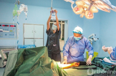 沈阳市医学院附属中心医院的手术室内,副主任医师姚阳(右)正在为一位手外伤的患者进行手术