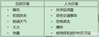 医院,尤其是大型学术中心,不仅仅肩负着平时百姓医疗服务工作,更肩负着重大灾难救灾的工作。美国医院承担的重大灾难主要包括两类:“自然灾害”和“人为灾害”。这两类灾难又可细分为以下情况: