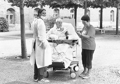 德国柏林沙里泰医院里,病人与医护人员交谈。