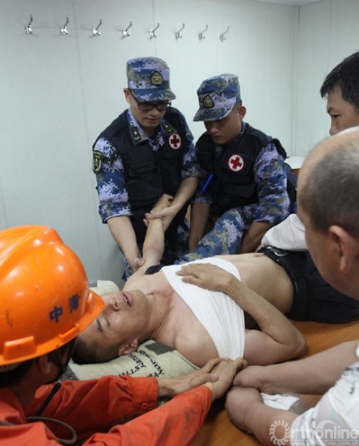 易红蕾与杨光涛两位医生在福全山号救治邓坚明 侯融/摄