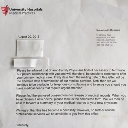 这样的“分手信”还真不多见。这家医院基础医疗部的副总裁托德·柴格儿(Todd Zeiger)说:“在我20年的行医生涯中,只记得有两三起这样的事件。”