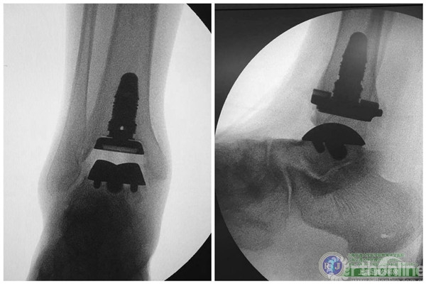 上海瑞金医院骨科足踝外科团队于2015年10月28日上午成功对该患者实施了第三代全踝关节假体(INBONE® II. Wright.)置换手术,手术过程非常顺利。手术中首先清理踝关节内外侧炎性组织及骨赘,将患足置于专门的定制支架中,在透视下反复调整足踝及导针位置,力求最高精确度。在截骨导板的定位下进行踝关节胫骨及距骨的截骨,试样假体大小,置入合适匹配的踝关节假体及垫片完成全踝关节假体的置换,全程手术时间90分钟。完成的全踝关节假体置换位置精确,假体设计稳定牢固,踝关节内外侧软组织平衡,达到了预期的效果。术后患者恢复良好,手术取得圆满成功。患者在休养五周左右以后可以下地行走,去除踝关节炎疼痛畸形的同时能够保留踝关节的活动度,为生活和工作提供极大便利。