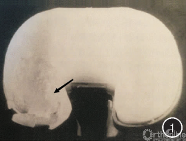 图1是一张翻修后取出的高分子聚乙烯胫骨平台照片。从图中我们可以看到胫骨平台聚乙烯衬垫的内、后方被严重磨损、破坏,这是由于高分子聚乙烯垫的质量不好造成的吗?那为什么衬垫的其他部分没有发生同样的破坏?客观地分析结果表明,这是由于应力过度集中造成的,这与Li等[3-4]观点一致。但为什么会造成应力集中?笔者经过认真的观察发现:这是由于没有了解和掌握患膝在长期屈膝、内翻畸形过程中胫骨发生了解剖学病理性旋转改变所造成的。
