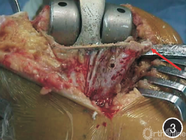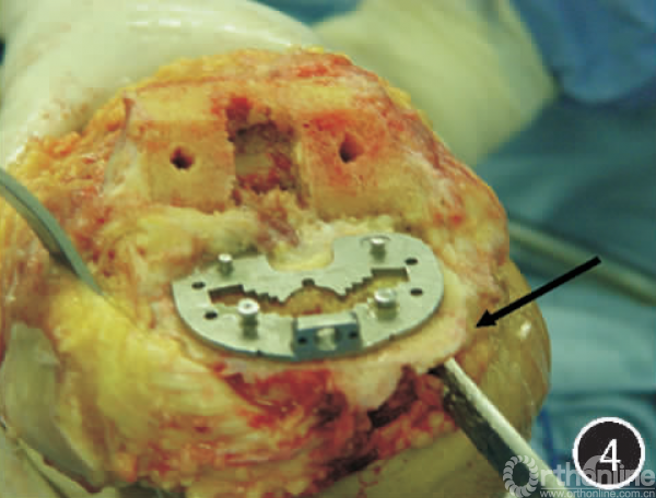 图4胫骨平台假体安放在正确位置后,外露部分为骨赘(箭)