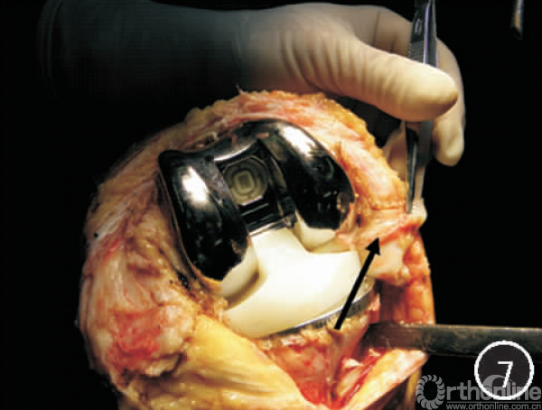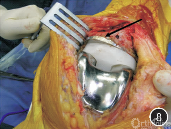 因此,正确的做法是胫骨平台假体必须要放置在白线之内,否则就要旋转错位。如果我们不将胫骨平台假体放置在白线之内,那就会使胫骨平台假体旋前,进而造成股骨与胫骨的受力点向胫骨平台后方转移,产生胫骨平台后方的应力集中,长期应力集中而造成胫骨平台聚乙烯垫的磨损和破坏。正确的手术操作应该是:把胫骨平台假体放到白线内之后,切除假体没有覆盖的骨赘,这样既矫正了旋转畸形,又能松解膝关节内侧副韧带的紧张(见图6)。