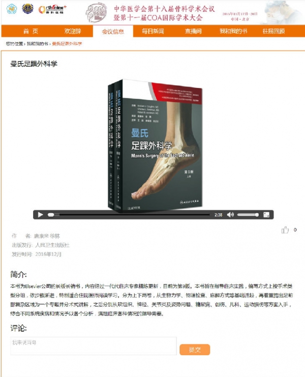 骨科在线微信平台:COA指定官方合作媒体,大会期间每日发布最新会议动态、年度学术精选与知名专家访谈。“我和我的书”也将作为骨科在线微信平台的重点推荐活动,在大会期间强力推出。