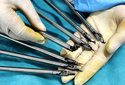 7月3日,天津医科大学总医院的医务人员展示适应腹腔内微创手术需求、并可完成复杂缝合打结操作的四自由度小型手术工具。