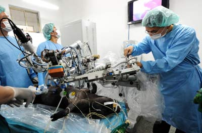 7月3日,天津医科大学总医院的医务人员运用“妙手A”系统进行实验动物胆囊摘除手术。