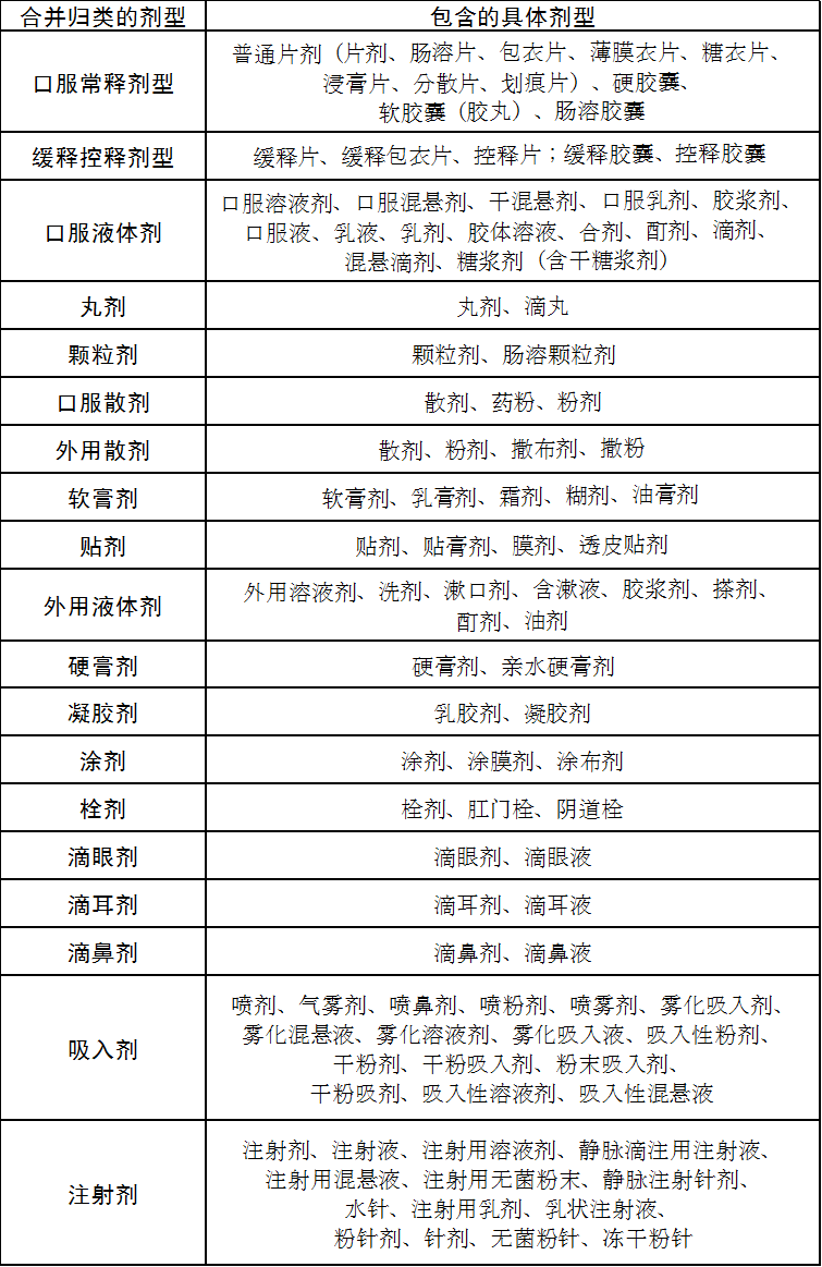 (六)西药剂型在《中国药典》“制剂通则”的基础上合并归类处理,未归类的剂型以《药品目录》标注的为准。合并归类的剂型所包含的具体剂型见下表: