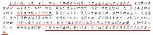 打破户籍、地域、身份、学历、人事关系等制约,促进卫生计生人才合理流动。改革医师执业注册制度,推进区域注册,促进人才合理流动。积极探索医师自由执业、医师个体与医疗机构签约服务或组建医生集团。在重点专科建设、职称评定、学术地位等方面对所有医疗机构同等对待。(Ps:规培期间好好锻炼自己,多点执业?只有自己实力强才是多点的资本啊。)
