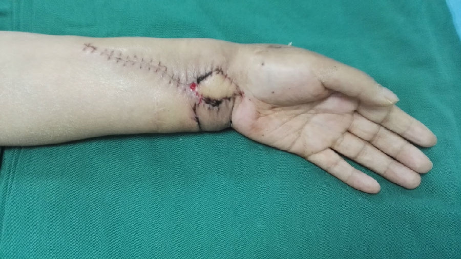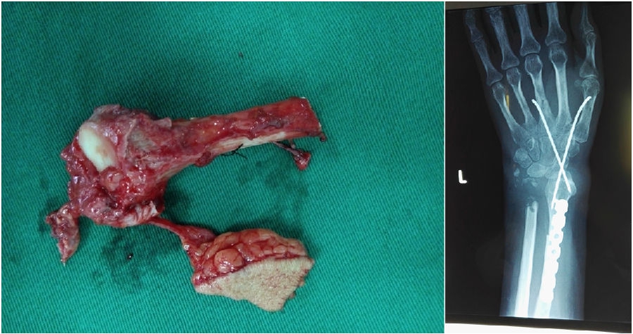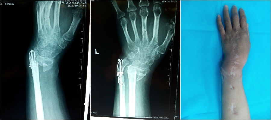2016年2月,44岁的高女士于不慎被钢丝绞伤,被同伴紧急送到天津医院救治,经检查发现,左前臂尺桡骨远端,靠近手腕部粉碎骨折,手部多发骨折,同时存在血运障碍,天津医院手显微外科一病区的接诊医生按照治疗原则,一期治疗以保肢为主。随后在急诊情况下为其实施了行清创内外固定术,保住了肢体,但是由于尺桡骨远端粉碎骨折,所以左桡骨骨折无法愈合,前臂远端畸形,腕关节活动严重受限,无法旋转,先行出院回家休养。