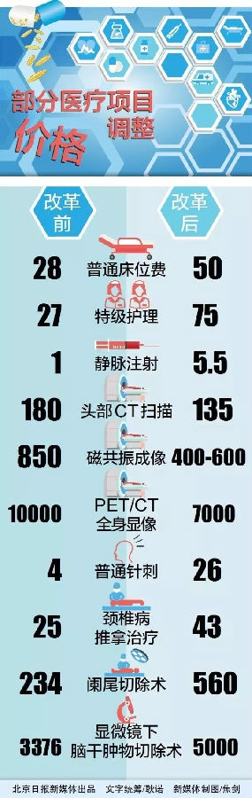 市发改委相关负责人表示,这次的价格调整可以概括为“一升两降”,即上调床位、护理、一般治疗、手术、中医等体现医务人员技术劳务价值项目价格,降低了CT、核磁等大型设备检查项目价格,并通过配套取消药品加成和药品阳光采购降低了药品价格。