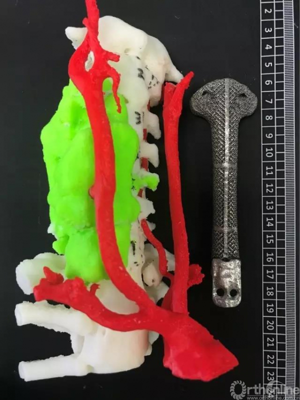 肖建如教授团队决定创新性地利用3D技术,为其量身打造一个钛合金假体,以代替彻底切除的全颈椎椎体。手术前,医生们依据患者辅助治疗后最新影像学数据资料,按照1:1的3D打印复制模型,制造出一个14厘米的立体精确全颈椎假体。