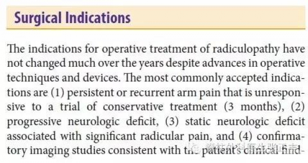 手术适应证:①病史超过三个月,严格保守治疗无效;②进行性神经损害;③合并脊髓型颈椎病表现;④保守治疗无效,神经症状明显。