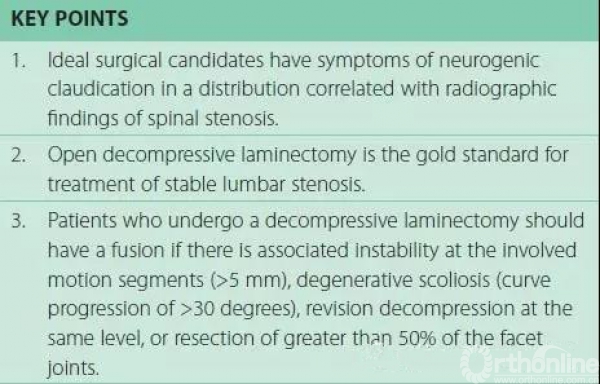 腰椎管狭窄症融合手术适应证:伴有腰椎不稳;伴有退变侧凸(>30度);同节段翻修手术;小关节切除大于50%。