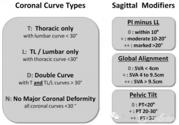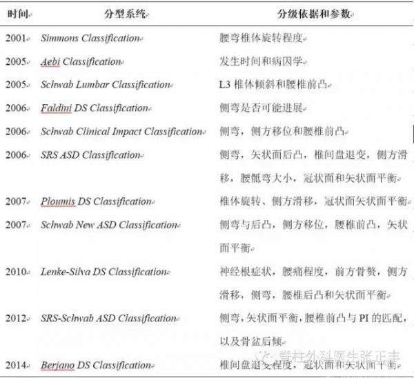 脊柱侧凸的分型众多,均试图根据影像学从脊柱畸形和平衡方面判断腰痛的发生,是否与临床上一致仍需要循征证据。目前学者较为认可是SRS-Schwanb和Lenke-Silva分型。