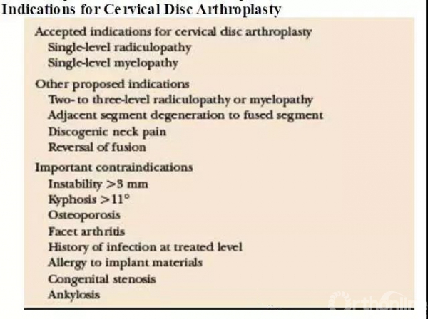 颈椎人工椎间盘置换术的手术适应证:小于60岁;颈椎屈伸活动度在3-11度;无小关节退变。