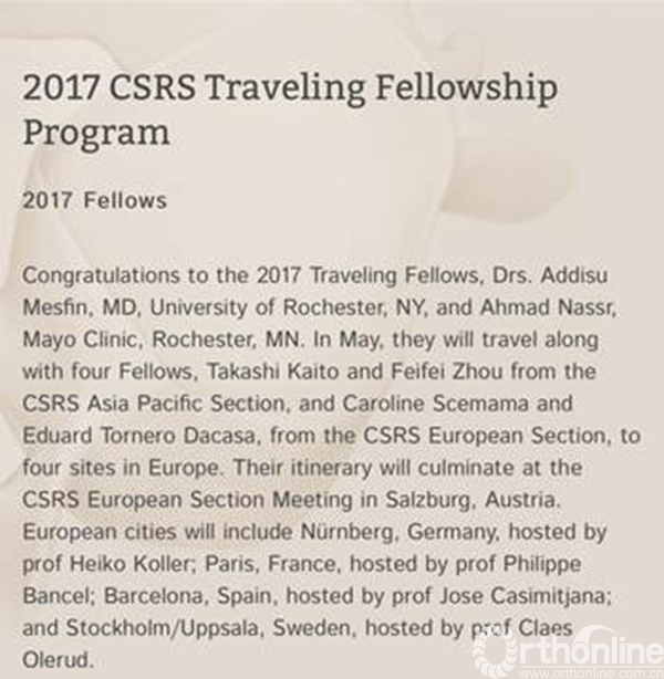 2015年开始,CSRS北美、欧洲、亚太分会为了肯定年轻医生在颈椎外科临床与基础研究中取得的成绩,鼓励国际间相互交流,设立了CSRS Travelling Fellowship。每2年一次,每次由一个分会作为东道主,来自三个分会分别推荐的6名年轻医生有机会在东道主分会中若干脊柱外科中心进行学术交流。