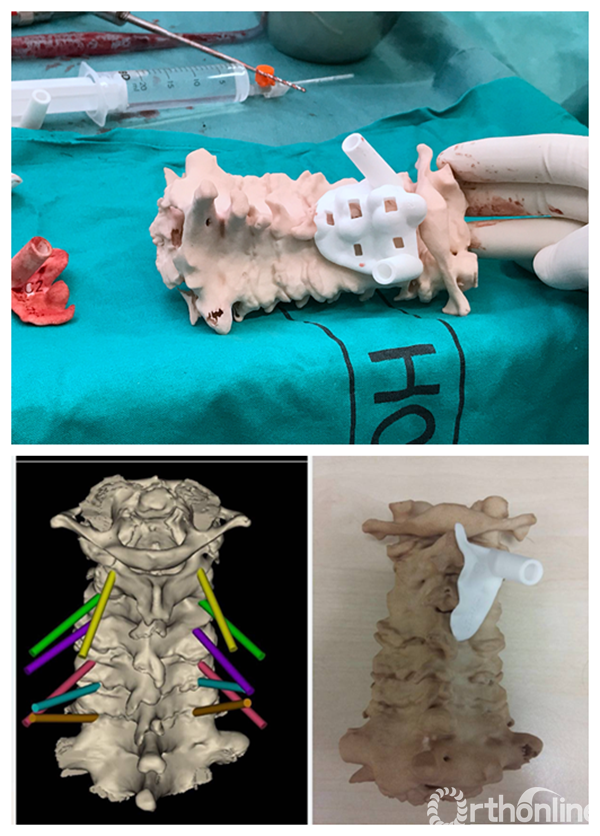 接着,我们和医院的医生一起对当日手术的患者进行了讨论。其中一例脊髓型颈椎病患者,拟行C2-T1颈后路减压内固定术,参加讨论的除了医生还有一位生物工程师,他平时与医生一起工作,对医生提出的一些设想进行完善并在临床中加以实现。今天他根据这位患者术前的CT影响,利用3D打印技术,设计了下颈椎椎弓根螺钉的置钉导板(图6)。