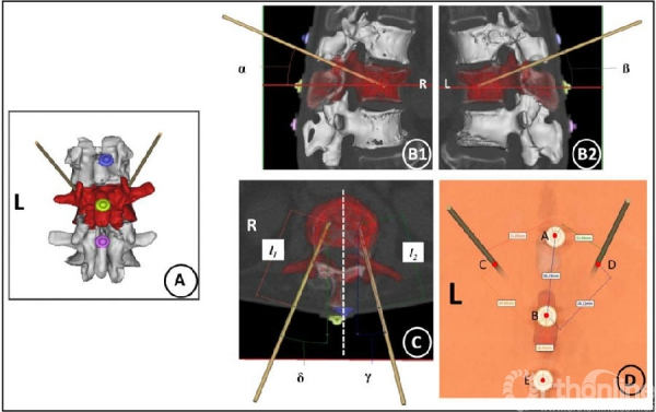 这种新技术以一例患者为例阐述了主要的技术流程。首先采集患者术前俯卧位病变椎体的薄扫CT图像(图1),并将其导入至交互式医学图像控制系统(MIMICS)软件中进行三维重建(图2)。在MIMICS中进行PVP模拟操作,并利用贴在患者背部正中的三个不透X线的定位片测量出穿刺需要的关键参数,包括:双侧皮肤手术实际穿刺点、双侧进针方向(外展角/头倾角)以及进针深度(图3),而后在这些参数引导下利用简单的测量工具进行精准PVP操作(图4-5)。