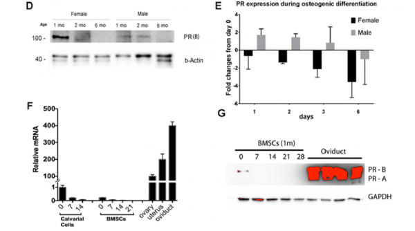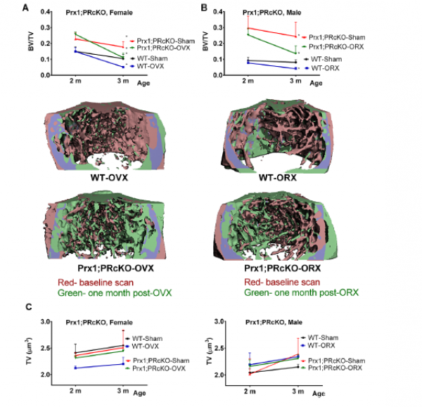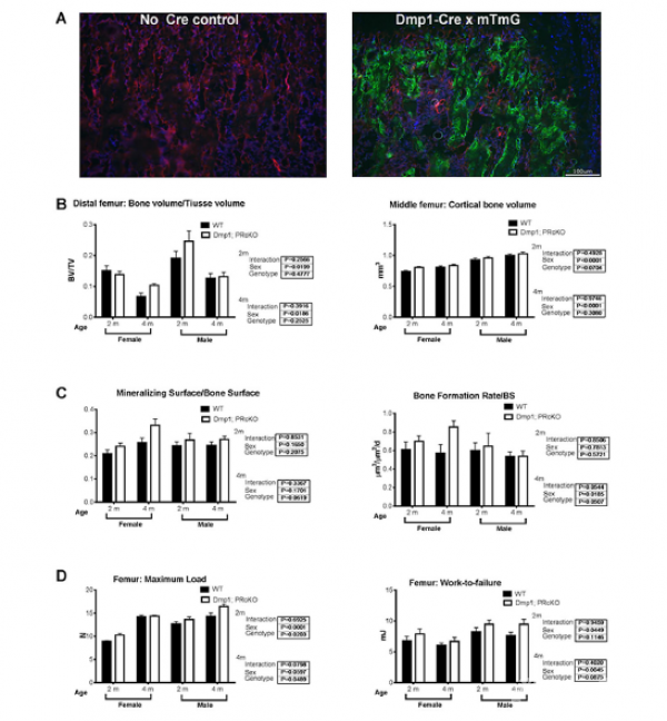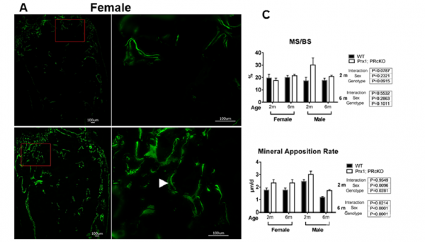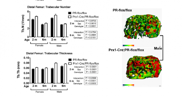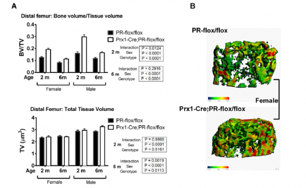 当条件性敲除间充质干细胞(MSC)的孕激素受体基因时,基因敲除小鼠的骨小梁体积增大,矿物结合率增高,骨沉积量增多。可以用骨髓间充质干细胞的数量增加及成骨分化能力增强来解释这一现象。其中雄性小鼠的成骨潜能能力增强较为明显。Prx1;PRcKO小鼠和野生型小鼠的年龄相关性小梁骨丢失率没有明显差异。两种基因型小鼠在快速骨生长期缺乏性激素都会发生快速骨质丢失。使用骨钙素-Cre(Bglap-Cre)在成熟成骨细胞中条件性敲除孕激素受体时,观察到小梁骨质量无明显差异。此外,三种孕激素受体敲除(PRcKO)小鼠的皮质骨质量与野生型小鼠相比均没有差异。总而言之,早期骨祖细胞中的孕激素受体失活能对小梁骨增长造成性别依赖效应,但成熟成骨细胞中孕激素受体失活则对骨量增长没有影响。成骨细胞谱系细胞中的孕激素受体缺失不会影响骨皮层的骨量。