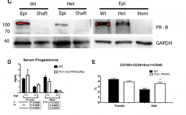 敲除早期骨细胞中的孕激素受体基因(通过Prx1标记),可以提高骨小梁的骨量并促进骨形成,并具有性别特异性。实验者条件性敲除了骨髓间充质干细胞中的PR基因,构建了Prx1;PRcKO小鼠系。Prx1;mT/mG报道模型证实了Prx1-Cre在长骨中的软骨形成细胞和成骨细胞中均有活性。收集野生型小鼠及杂合系(PR-flox/t)或纯合系(PR-flox/flox)Prx1; PRcKO小鼠的股骨蛋白,用蛋白印迹实验分析证实了Prx1;PRcKO小鼠的骨组织已经成功敲除孕激素受体,在股骨轴上检测不到PR表达(图2C)。6月龄的雄性小鼠与同龄雌性小鼠相比,血清孕酮激素水平明显较低。2-6月龄的Prx1;PRcKO小鼠和野生型小鼠(对照组)相比,血清孕酮激素水平没有统计学差异。2月龄的雄性Prx1;PRcKO纯合子小鼠的BMSCs中的间充质干细胞样细胞(CD105tCD29tSca1tCD45–)水平比野生型小鼠的同种细胞水平高40%。(图2E).