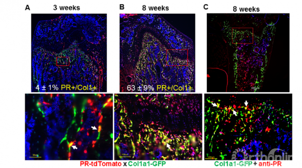 实验者构建了杂交小鼠系以研究孕激素受体在骨组织的分布特征。实验者构建了PR-Cre;Ai14D;Col1a1-GFP小鼠,该小鼠表达孕激素受体的细胞表现出红色荧光,而成骨细胞/骨细胞则显示为绿色荧光。在分化过程中表达孕激素受体的成骨细胞则表现为黄色荧光覆盖。收集3〜8周龄的PR-Cre/Ai14D/Col1-GFP小鼠的右股骨远端;制成冷冻切片。