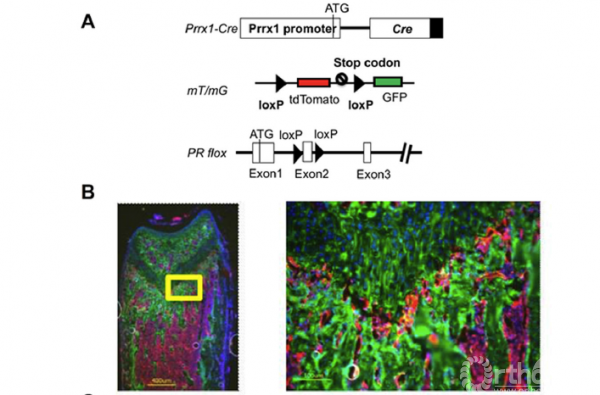 孕激素对骨形成的影响仍未明确,现有研究大多使用孕酮激动剂或拮抗剂来评估其在临床中对骨量的影响。用孕酮激动剂或拮抗剂实验可能会影响其他激素水平,包括雌激素,雄激素和促卵泡激素(FSH)等等。也有研究者选用了高骨量表型的孕激素受体(PR)种系敲除(PRKO)小鼠进行研究。与野生型(WT)小鼠相比,雌性PRKO小鼠的骨形成量较高,而雄性PRKO小鼠的骨吸收量较低。基于已有的报告,我们假设孕激素受体可以直接参与骨形成和骨量积累的调节。实验者分别选用了以下三种能敲除孕激素基因(PRcKO)的骨组织特异性驱动子:Prx1-Cre,其靶向细胞为早期的骨髓间充质干细胞(MSC);Dmp1-Cre,靶向细胞为骨细胞和间充质谱系细胞亚群;骨钙素-Gre(Bglap-Cre),主要靶向细胞为成熟成骨细胞。