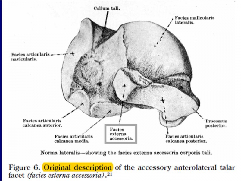 距骨前外侧副关节(accessory anterolateral talar facet)是人类距骨的一个变异,发生率约为10.6%,它是距骨前外侧关节的延续与延长。其中部分人在足部的长期运动中可以产生相应的症状,而这些症状在儿童早期往往被忽视或者处于代偿阶段表现不明显,随着体重和运动量的增加,在青少年期往往症状明显而就诊。2008年Martus提出其是一种新的临床诊断,在僵硬性平足中,距骨前外侧副关节是引起疼痛性距下关节撞击的病因之一。这里结合相关文献向大家介绍该病的临床诊断与治疗。
