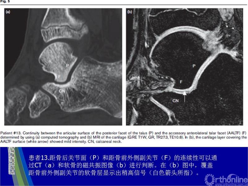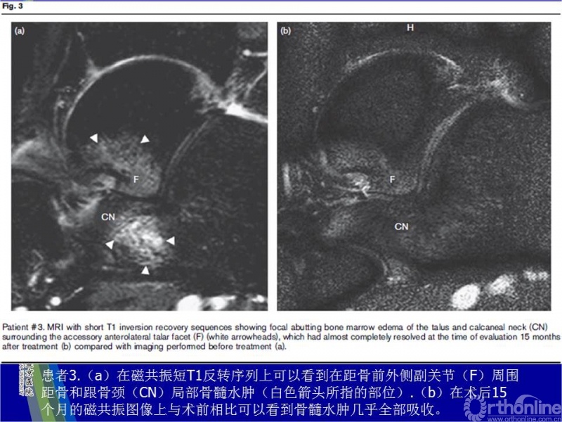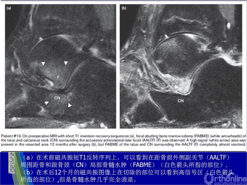 3. 临床表现为行走时跗骨窦区疼痛。CT或磁共振提示距骨前外侧副关节的存在,同时排除跗骨联合。磁共振显示副关节周围距骨和跟骨颈部水肿