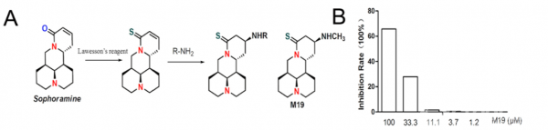 但是在研究过程中,我们发现,苦参碱溶解度低,生物利用度差,存在一定细胞毒性。于是在槐果碱的基础上,课题组通过结构修饰、活性测定构效关系等手段进一步优化其结构,降低毒性、提高活性及生物利用度,经Lawesson’s试剂处理将其羰基氧原子转换成硫原子,再通过加成反应在13位引入一系列的含胺基团,制备得到MASM(编号:M19)。对其抗炎活性研究表明:M19能够显著抑制LPS诱导巨噬细胞激活并显著抑制NF-κB的激活。