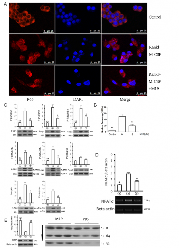 图2:M19能显著抑制RANKL介导的下游细胞信号通路激活,与细胞内RPS5结合,稳定其浓度。