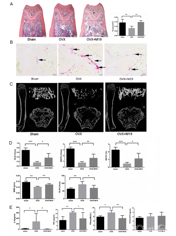 图5:M19显著增加OVX小鼠股骨远端骨小梁数量,TRAP染色显示能够抑制破骨细胞生成。