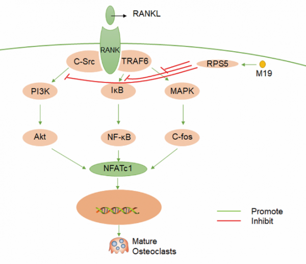 M19通过结合RPS5,抑制RPS5在破骨分化中的降解,抑制RANKL介导的NK-κB,MAPK, AKT通路激活,减少NFATc1转录因子的表达,抑制破骨细胞的激活,减轻OVX小鼠骨质丢失。