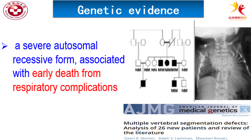 这篇文章进一步对26例多发椎体畸形的CS进行遗传方式的研究。发现有一种多椎体异常的CS患者常常在儿童时期死于呼吸衰竭,且根据家系图谱推测这种类型的CS有可能为常染色体隐性遗传。