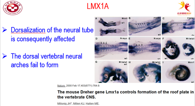 有动物模型发现小鼠Lmx1a对中枢神经系统的背侧细胞和脊椎的发育有重要的作用,基因敲出Lmx1a的小鼠可发生包括尾椎发育畸形、脊髓发育异常等畸形表现。也有中国学者通过对LMX1A 上关键单核苷酸多态性位点的初步筛查,用关联分析的方法初步探索LMX1A 基因与中国汉族人群CS及其不同临床表型之间的关联。发现该基因有三个位点与CS有关。
