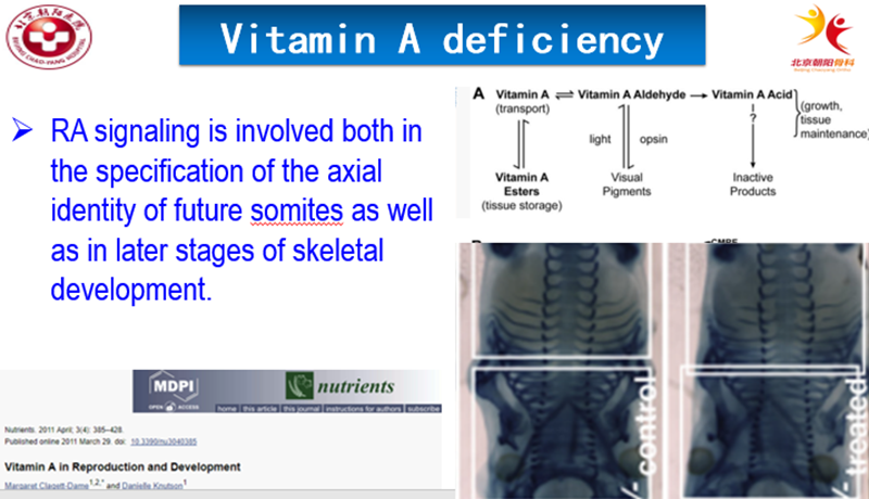 在动物实验中发现,在胚胎期分别给予母鼠不同剂量维生素A处理后,维生素A缺乏组小鼠出现颈椎椎弓根缺失、胸骨发育不良、肋骨缺失临床表现。从而证实了维生素A与椎体发育有关。
