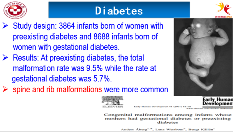 也有学者发现孕期患糖尿病有很多的致畸效应,包括神经管缺陷、尾端发育不全和椎体异常等先天性疾病,流行病学调查显示,不管怀孕前有糖尿病的孕妇还是妊娠期糖尿病的孕妇,其胎儿畸形的概率均比正常健康产妇高。